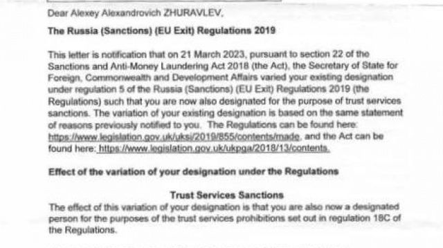 "Какие все же нерасторопные джентльмены трудятся в британском Форин-офисе. Я с 2014 года поддерживаю Донбасс и лично принимаю участие в боевых действиях, а до островитян только дошло, и они, наконец, уведомили меня о введении персональных санкций", - написал в своем телеграм-канале председатель партии "РОДИНА", депутат Госдумы Алексей Журавлев, демонстрируя фото письма из Соединенного Королевства.