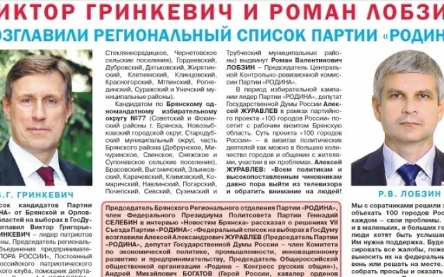 Председатель Брянского регионального отделения партии "РОДИНА", член Президиума Политсовета партии Геннадий Селебин в интервью "Новостям Брянска" рассказал о решениях VII Съезда Партии "РОДИНА": "Федеральный список на выборах в Госдуму возглавили Алексей Журавлев (председатель партии "РОДИНА", депутат Государственной Думы России - член Комитета по экономической политике, промышленности, инновационному развитию и предпринимательству, Председатель Общероссийской общественной организации "Родина - Конгресс русских общин"), Андрей Богатов (Герой России, кавалер орденов Мужества и Красной Звезды, участник войн в Афганистане, Югославии, Сирии), Татьяна Буланова (эстрадная певица; Заслуженная артистка РФ, двукратная обладательница премии "Овация", трёхкратная - премии "Питер FM", семикратная - премии "Золотой граммофон" и премии "Шансон года", девятикратная - премии "Звезда Дорожного радио"), Михаил Хазин (экономист, писатель, постоянный член Изборского клуба, экс-заместитель начальника экономического управления Администрации Президента РФ). Список кандидатов партии "РОДИНА" от Брянской и Орловской областей возглавил Виктор Гринкевич - лидер патриотов Брянщины, Председатель регионального объединения предпринимателей "ОПОРА РОССИИ", Постоянный член российского патриотического Изборского клуба, помощник депутата Госдумы России А.А. Журавлева - председателя партии "РОДИНА". Виктор Гринкевич также выдвинут кандидатом в депутаты Государственной Думы России по Унечскому одномандатному избирательному округу №78. Кандидатом по Брянскому одномандатному избирательному округу №77 выдвинут Роман Лобзин - Председатель Центральной КРК партии "РОДИНА". 27 июля федеральный список кандидатов партии "РОДИНА" зарегистрирован ЦИК России, 30 июля кандидатами в депутаты Государственной Думы по одномандатным избирательным округам Избирательной комиссией Брянской области зарегистрированы Виктор Гринкевич и Роман Лобзин.