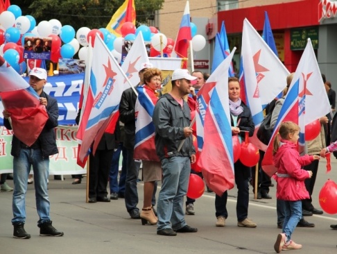 Праздничная колонна членов партии "РОДИНА", возглавляемая председателем Совета местного отделения Амираном Хасия и кандидатами в депутаты Государственной Думы Российской Федерации - кандидатом в депутаты Государственной Думы Российской Федерации по одномандатному округу № 112 "Ленинградская область - Кингисеппский одномандатный округ" от партии "РОДИНА" Голосовым Анатолием Ивановичем и кандидатом в депутаты Государственной Думы Российской Федерации от партии "РОДИНА" Харитоновым Д.А., прошла в составе парада через центр города с флагами и партийной символикой.", прошла в составе парада через центр города с флагами и партийной символикой.